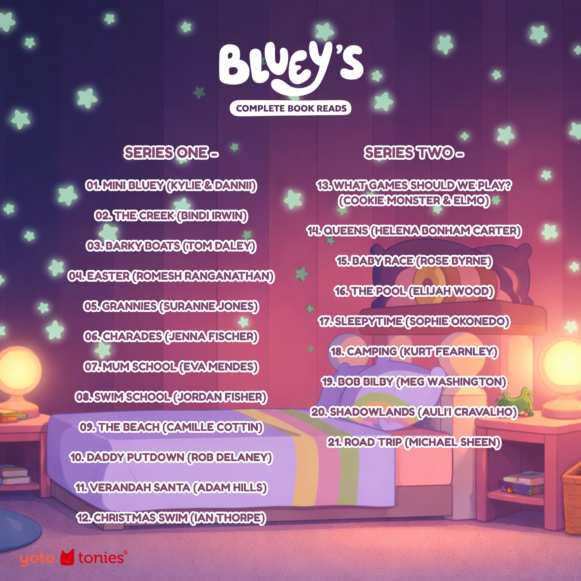 Bring the magic of Bluey to storytime, family fun, and cozy moments with this complete digital collection of all 21 Bluey Book Reads episodes — including 12 from Series 1 and 9 brand-new episodes from Series 2. This collection comes as MP3 files with a helpful Download Info PDF, making it easy to enjoy on Toniebox, Yoto Player, iPhone, tablets, and computers. Perfect for engaging your little ones in screen-free storytelling, family sing-alongs, or relaxing downtime.